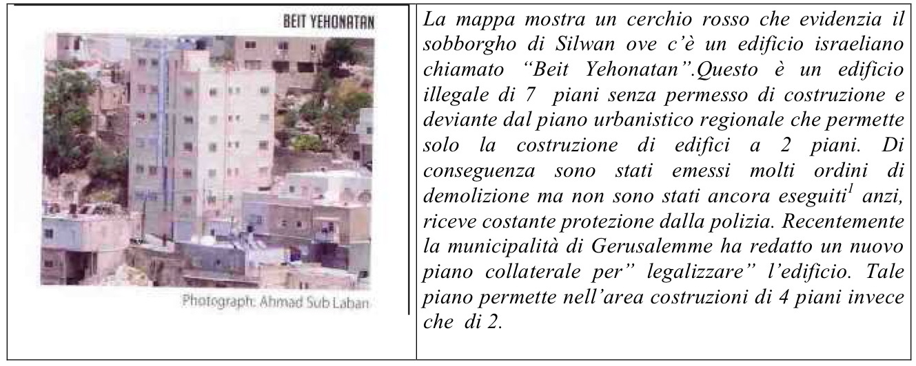 La mappa mostra un cerchio rosso che evidenzia il sobborgho di Silwan ove c’è un edificio israeliano chiamato “Beit Yehonatan”. Questo (che trovate in allegato) è un edificio illegale di 7 piani senza permesso di costruzione e deviante dal piano urbanistico regionale che permette solo la costruzione di edifici a 2 piani. Di conseguenza sono stati emessi molti ordini di demolizione ma non sono stati ancora eseguiti anzi, riceve costante protezione dalla polizia. (In gennaio 2007, La Corte civile di Gerusalemme per gli Affari locali ordinò la chiusura della casa. Da allora il caso è passato attraverso tutte le istanze della corte che hanno confermato il verdetto. Da luglio 2008 c’e stata un’ “ordinanza attiva” ovvero una ordinanza della corte che la municipalità doveva eseguire immediatamente. Il giudice G. Canfy- Steinitz ha respinto l’appello senza la possibilità che i difensori si appellassero alla corte suprema ma l’ordine di demolizione non è stato ancora eseguito).